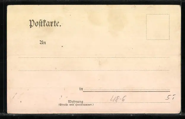 Personenbezogene Daten auf der Rückseite der Karte wurden durch blauen Textmarker unkenntlich gemacht. Die blauen Stellen sind auf die Vorderseite durchgeweicht und wirken sich negativ auf das Postkartenfoto aus