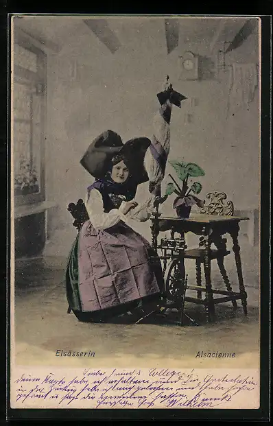 AK Junge Elsässerin an einem Spinnrad sitzend
