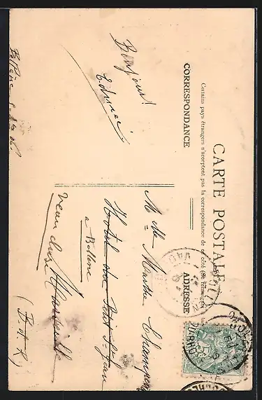 Personenbezogene Daten auf der Rückseite der Karte wurden durch blauen Textmarker unkenntlich gemacht. Die blauen Stellen sind auf die Vorderseite durchgeweicht und wirken sich negativ auf das Postkartenfoto aus