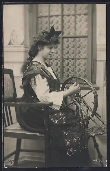AK Junge Frau arbeitet am Spinnrad