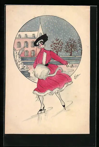 AK Junge Frau auf Schlittschuhen vor Kirche