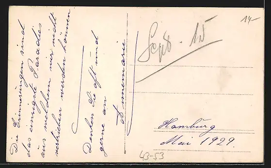 Personenbezogene Daten auf der Rückseite der Karte wurden durch blauen Textmarker unkenntlich gemacht. Die blauen Stellen sind auf die Vorderseite durchgeweicht und wirken sich negativ auf das Postkartenfoto aus