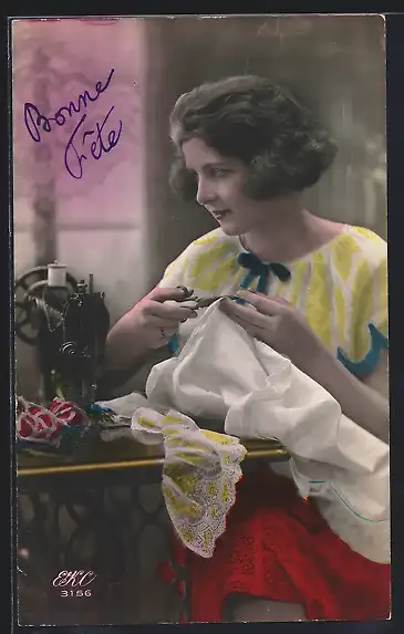 AK Junge Frau beim Nähen, Nähmaschine