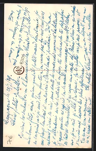 Personenbezogene Daten auf der Rückseite der Karte wurden durch blauen Textmarker unkenntlich gemacht. Die blauen Stellen sind auf die Vorderseite durchgeweicht und wirken sich negativ auf das Postkartenfoto aus