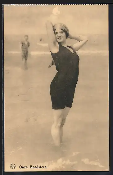 AK Junge Frau im Badeanzug am Strand, Bademode