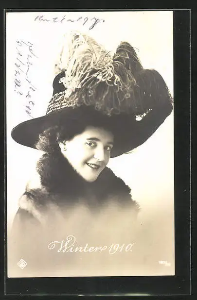 AK Junge Frau im Mantel mit Federhut, Winter 1910
