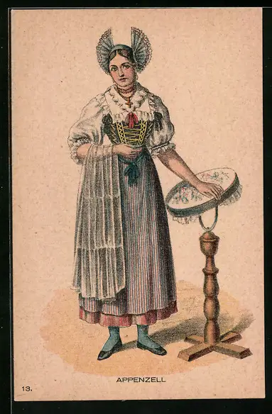 AK Junge Frau in Appenzeller Tracht mit Stickrahmen