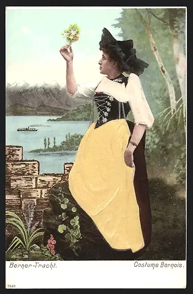 AK Junge Frau in Berner Tracht, zum Teil aus echtem Stoff, mit einer Blume in der Hand
