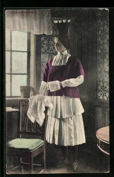 AK Junge Frau in Sylter Nationaltracht in einer Stube