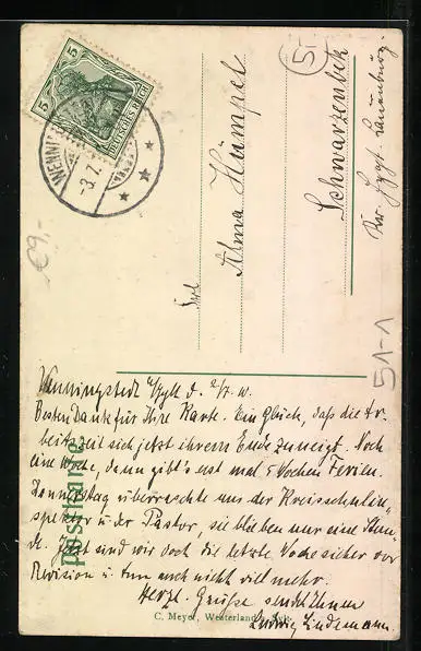 Personenbezogene Daten auf der Rückseite der Karte wurden durch blauen Textmarker unkenntlich gemacht. Die blauen Stellen sind auf die Vorderseite durchgeweicht und wirken sich negativ auf das Postkartenfoto aus