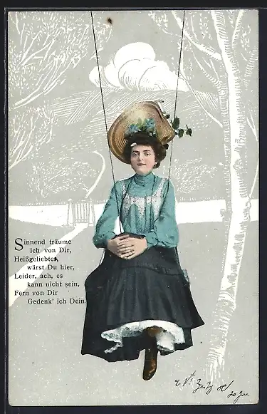 AK Junge Frau in blauer Bluse auf einer Schaukel