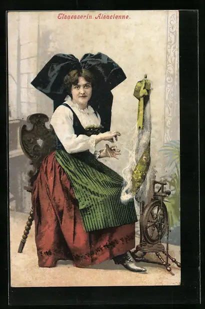 AK Junge Frau in elsässer Tracht am Spinnrad