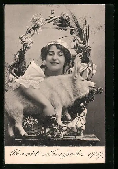 AK Junge Frau mit Blumenkorb und Ferkel