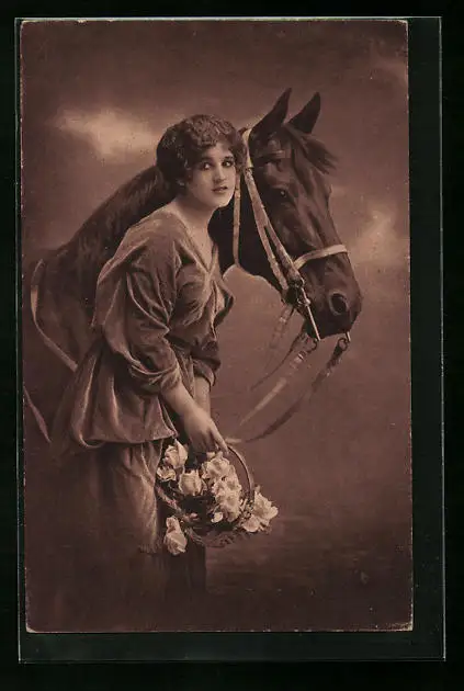 AK Junge Frau mit Blumenkorb vor Reitpferd