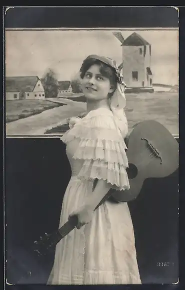 AK Junge Frau mit Gitarre vor Windmühlen-Panorama