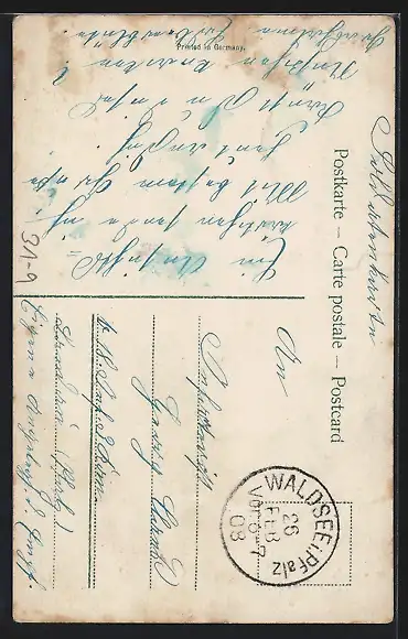 Personenbezogene Daten auf der Rückseite der Karte wurden durch blauen Textmarker unkenntlich gemacht. Die blauen Stellen sind auf die Vorderseite durchgeweicht und wirken sich negativ auf das Postkartenfoto aus