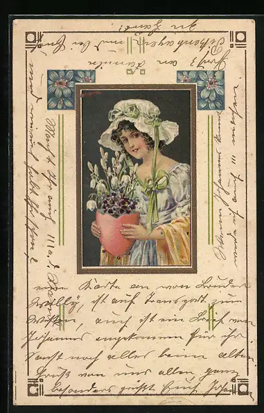 AK Junge Frau mit Haube und Frühlingsblumen, Frohes Osterfest