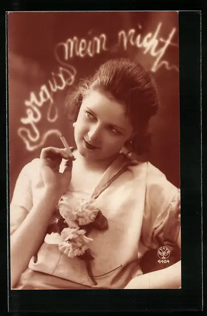 AK Junge Frau mit Zigarette, Vergiss mein nicht als Rauch