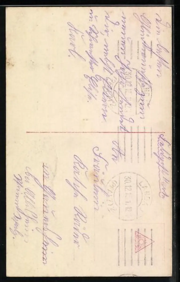 Personenbezogene Daten auf der Rückseite der Karte wurden durch blauen Textmarker unkenntlich gemacht. Die blauen Stellen sind auf die Vorderseite durchgeweicht und wirken sich negativ auf das Postkartenfoto aus
