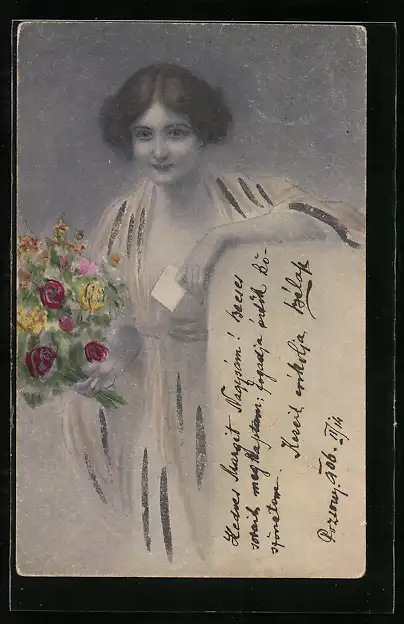 AK Junge Frau mit einem Strauss Blumen, Jugendstil
