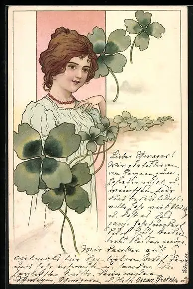 AK Junge Frau mit vierblättrigem Klee, Jugendstil