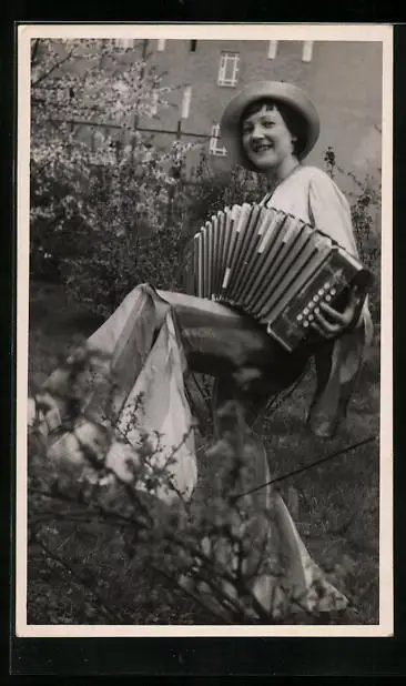 AK Junge Frau sitzt im Garten und spielt ihr Akkordeon