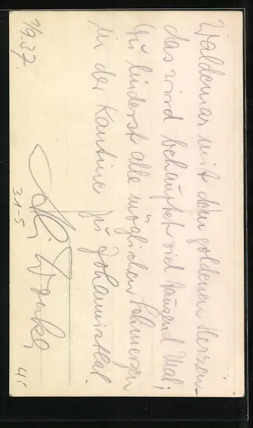 Personenbezogene Daten auf der Rückseite der Karte wurden durch blauen Textmarker unkenntlich gemacht. Die blauen Stellen sind auf die Vorderseite durchgeweicht und wirken sich negativ auf das Postkartenfoto aus