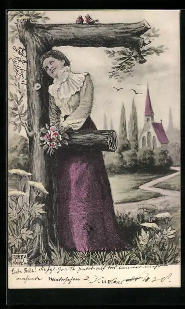 AK Junge Fraue mit Blumen am Buchstaben F, Im Hintergrund Kirche