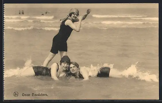 AK Junge Frauen in Badeanzügen spielen im Wasser