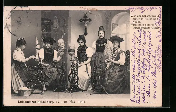 AK Junge Frauen in der Spinnstube, Schwarzwälder Tracht