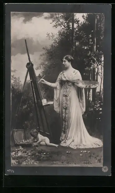 AK Junge Malerin an der Staffelei und Kleinkind in einer Landschaft