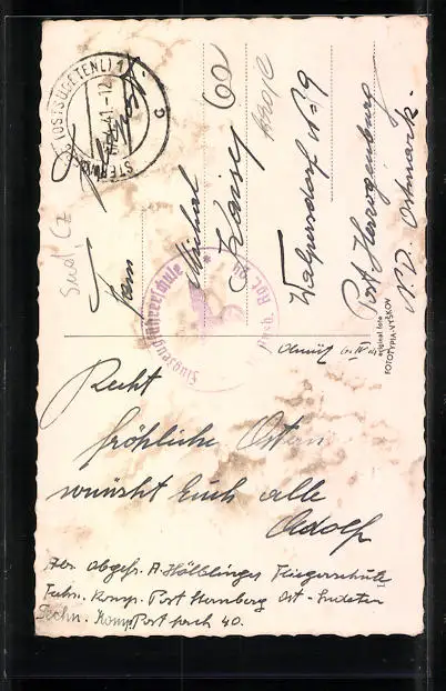 Personenbezogene Daten auf der Rückseite der Karte wurden durch blauen Textmarker unkenntlich gemacht. Die blauen Stellen sind auf die Vorderseite durchgeweicht und wirken sich negativ auf das Postkartenfoto aus