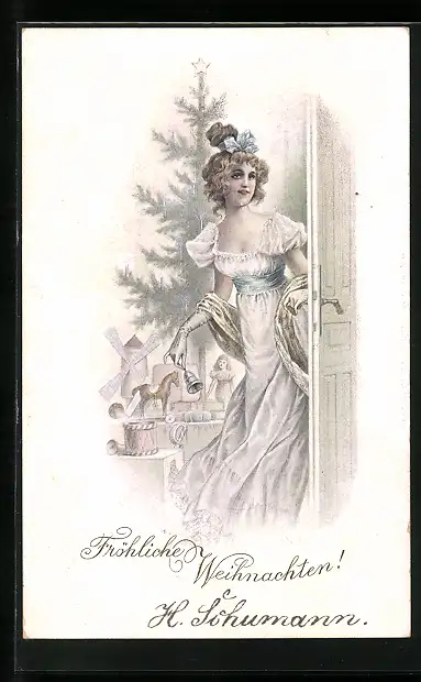 AK Junge Mutter läutet zur Bescherung, Weihnachtsgruss, Jugendstil