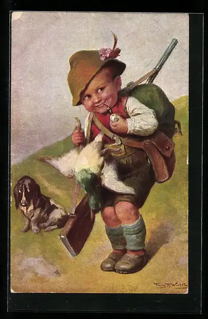 AK Junge als Jäger mit Dackel & erlegter Wildente