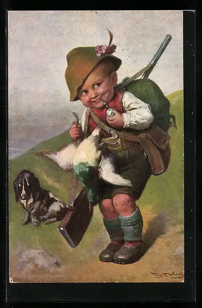 AK Junge als Jäger mit erlegter Wildente & Dackel