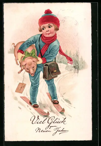 AK Junge auf Skiern mit einem Ferkel, Neujahrsgruss