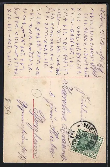 Personenbezogene Daten auf der Rückseite der Karte wurden durch blauen Textmarker unkenntlich gemacht. Die blauen Stellen sind auf die Vorderseite durchgeweicht und wirken sich negativ auf das Postkartenfoto aus