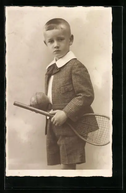AK Junge im Portrait mit einem Tennisschläger in der Hand