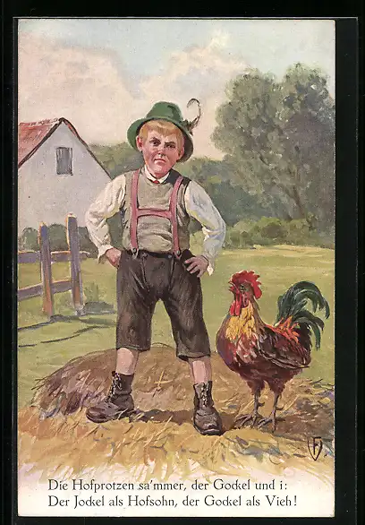 AK Junge in Tracht steht mit dem Hahn auf dem Misthaufen