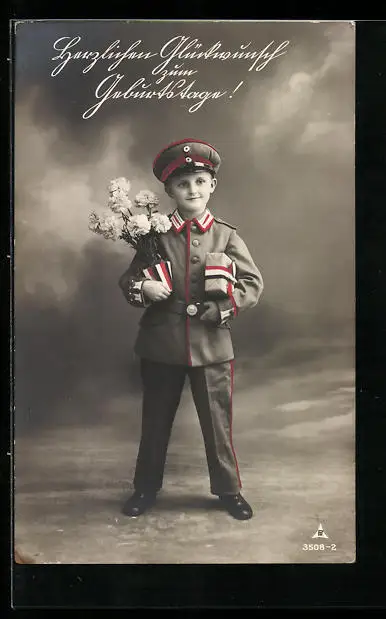 AK Junge in Uniform mit Geschenk und Blumen