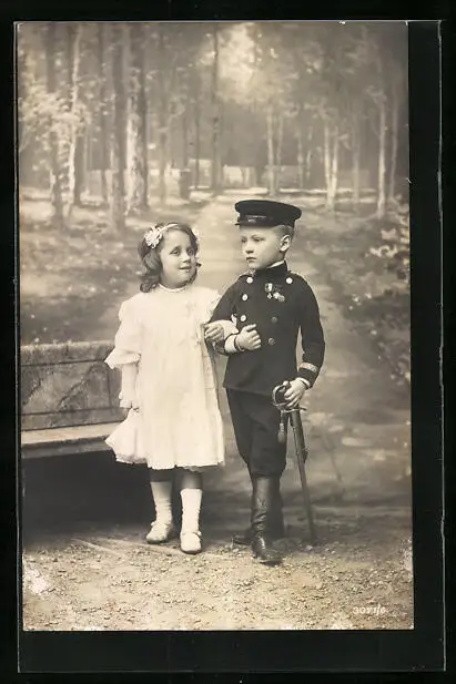 AK Junge in Uniform mit Mädchen im Arm, Kinder Kriegspropaganda