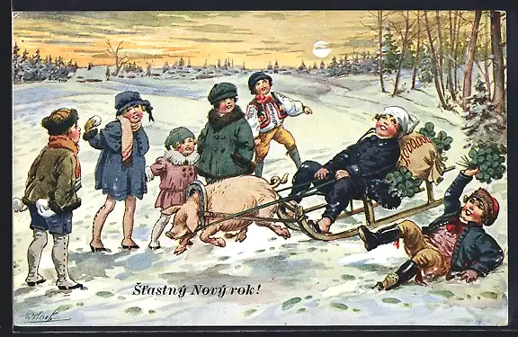 AK Junge mit Geldsack auf Schweineschlitten, Neujahrsgruss