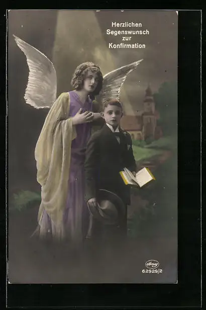AK Junge mit Hut und Gebetsbuch zur Konfirmation, Schutzengel