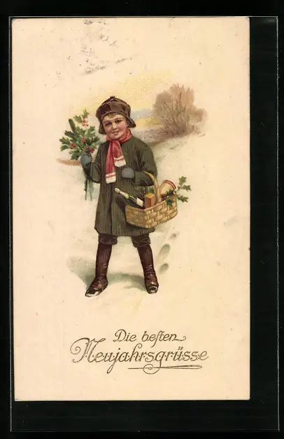 AK Junge mit Korb mit Sekt und Stechpalmenzweigen