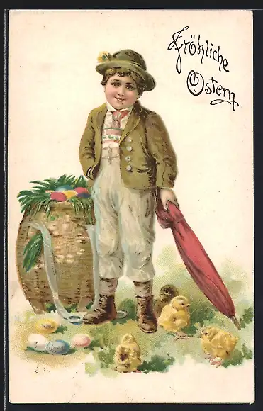 AK Junge mit Korb voll mit Ostereiern, Osterküken um ihn herum