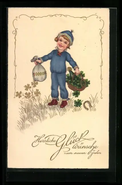 AK Junge mit Korb voller Kleeblättern zu Neujahr