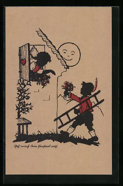 AK Junge mit Leiter bringt seiner Liebsten Blumen, Scherenschnitt