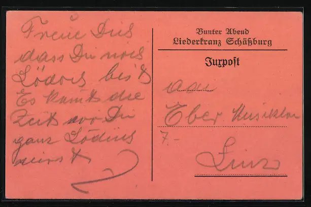 Personenbezogene Daten auf der Rückseite der Karte wurden durch blauen Textmarker unkenntlich gemacht. Die blauen Stellen sind auf die Vorderseite durchgeweicht und wirken sich negativ auf das Postkartenfoto aus