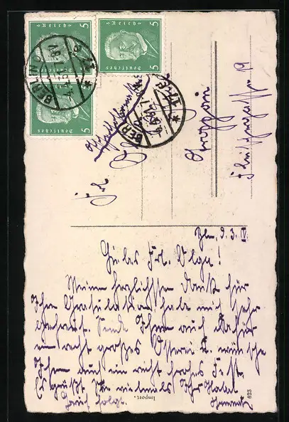 Personenbezogene Daten auf der Rückseite der Karte wurden durch blauen Textmarker unkenntlich gemacht. Die blauen Stellen sind auf die Vorderseite durchgeweicht und wirken sich negativ auf das Postkartenfoto aus