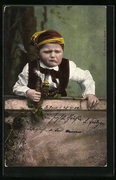 AK Junge mit Pfeife lehnt sich über eine Mauer
